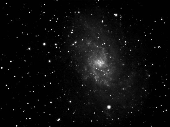 Object: M33 - The Triangulum Galaxy: A spiral galaxy located in the constellation Triangulum. The approximate distance is 3 million light years. A visual brightness of 5.7 (mag). Telelscope: Stellarvue 80mm f/6, piggybacked on LX200 Camera: Starlight Xpress MX916, w/ SXV upgrade Guiding: SXV guider through LX200 10", f/4.0 Exposures: 15 x 4 min (1 hr), 1x1 binned Filters: IDAS LPS, Comments: Taken from Home. Looks like I could use a few more integrations and will probably try 5 min each for next attempt. |