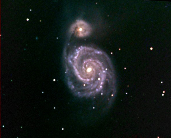 Object: M51 - Whirlpool Galaxy: A spiral galaxy located in the constellation Canes Venatici. The estimated distance is approximately 37 million light years. M51 has a visual brightness of 8.4 (mag.) Telelscope: LX200 10" @ f/4 Camera: Starlight Xpress MX916, w/ SXV upgrade Guiding: SXV Guider through Stellarvue AT1010 @ f/6, piggybacked on LX200 Exposures: L=25 X 240s (100 min), 1x1 binned, RGB=12 X 240s (48 min each) Filters: Schuler LRGcBc Comments: Taken from home. Captured and processed with Astroart 3.0. Layers in Photoshop 7.0. I took the Lum on the first night and then RGB on second night. This was my second attempt with M51. The first attempt through the LX200. The image scale was ~2.33 arcsec/pix. |