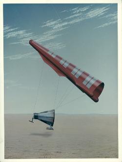 | Gemini - Vintage Color Artist Concept -McDonnell Aircraft Photo ID: D4C 9729 Photo: 8.5 x 11 Color photo on fiber based paper with repeating "A KODAK PAPER" watermarks on reverse. McDonnell Aircraft Corporation stamp and photo ID on reverse. Photo in excellent, near mint, condition. Description: Artist concept drawing of the Rogallo's flexible wing (Parawing) which was tested by NASA as a steerable parachute to retrieve Gemini space capsules and retrieve used rocket stages. |