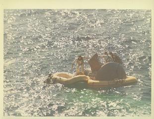 | GT-5, Vintage Color - NASA Photo ID: S-65-51653 Description: 29 August 1965 - Cooper can be seen climbing into the life raft and Conrad is climbing out of the spacecraft. Navy frogmen are seen ready to assist when needed. A Navy helicopter will pick the GT-5 crew up and fly them to the prime recovery vessel, the carrier USS Lake Champlain. Photo: 8 x 10 in excellent + condition on a fiber based paper with repeating "A KODAK PAPER" water marks and purple NASA detailed text on reverse. |