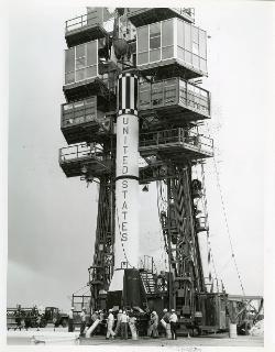 | MR-4: Vintage B/W Glossy - NASA / USAF Photo ID: LOD 61-5804 Description: Gus at Pad 5 during the erection of vehicle MR-4. Photo: 8x10 in excellent condition with US Air Force Photo stamp on reverse with short description dated 6/22/61. Nice fiber based paper with RCA Inspector Acceptable stamp on reverse. |